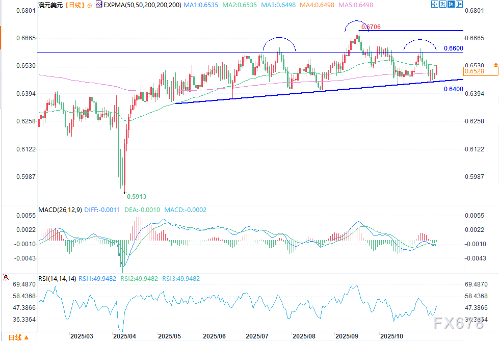 日线图显示,澳元/美元在过去几个月一直处于波动状态。该货币对已从0.6700的高点跌至当前的0.6528附近。