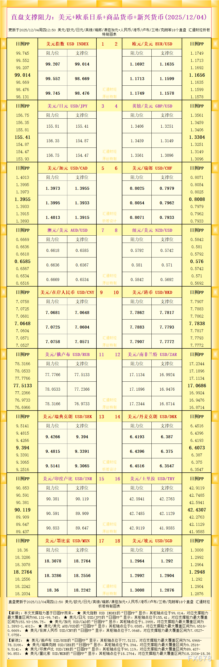 exness官网注册:一张图看18个直盘外汇支撑阻力:美元+欧系日系+商品货币+新兴货币(2025年12月4日)