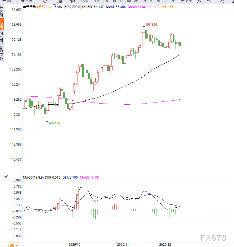 综合基本面与技术面判断,日元短期偏强、美元承压。BoJ加息预期、制造业景气改善以及美日利差预期背离,支撑日元走强。重点关注155.00支撑位的企稳与技术反弹机会,同时警惕美元短线回升带来的阻力区域承压风险。