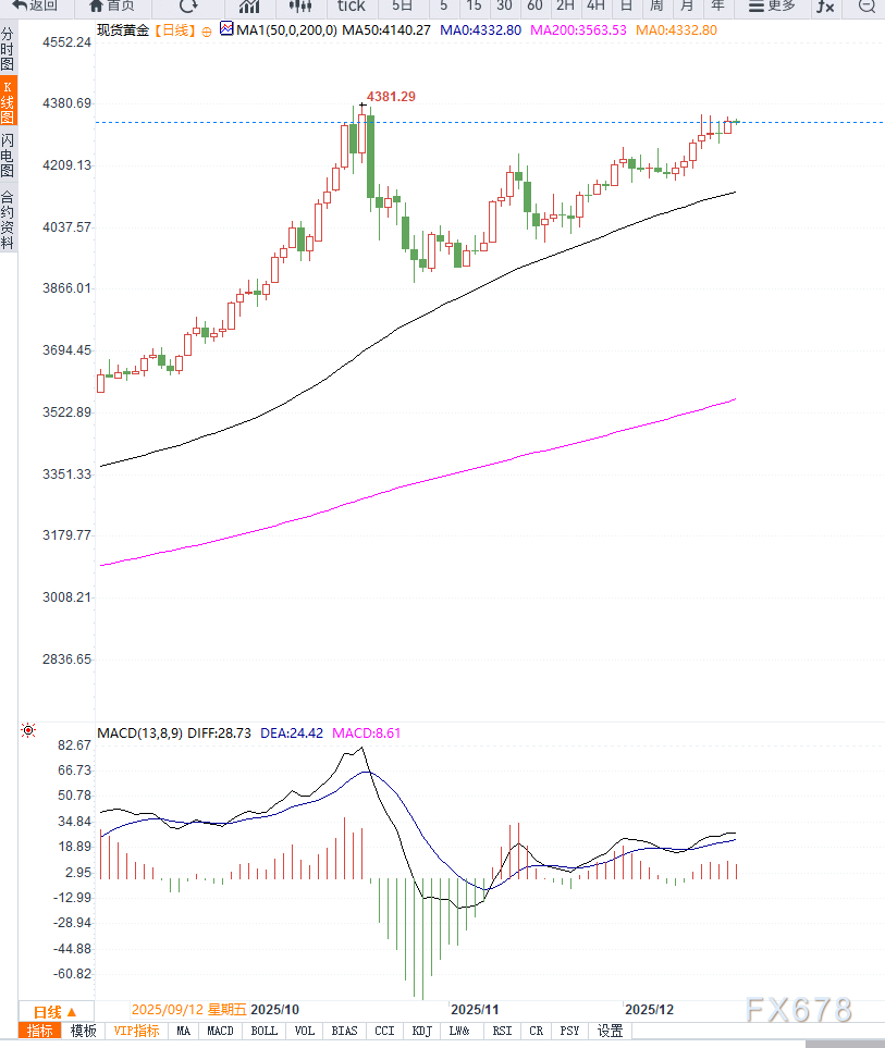 反之,若回调延续且价格跌破4300美元(12月17日低点),短线可能吸引更多卖盘,下方需重点关注4270美元以及4230美元附近的100日EMA支撑。整体而言,技术面显示黄金仍处于高位整理阶段,多头结构尚未被破坏。