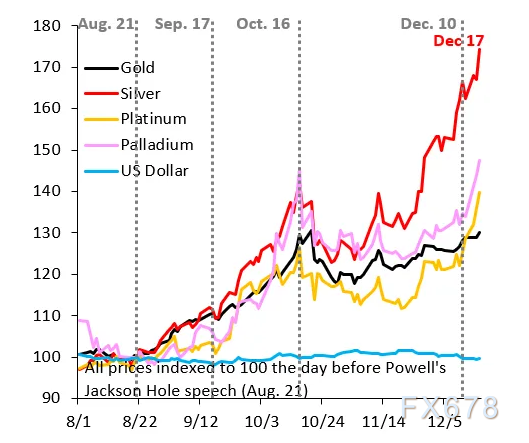 白银涨势正开始重现黄金数月前的狂热态势——这意味着涨势正蔓延至铂、钯等其他贵金属。若质疑这是否存在泡沫,此类“传染效应”已不言自明。
