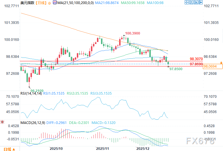 汇通财经APP讯——周二(12月23日)美元指数走弱,但并未出现大幅崩盘。价格早盘下探至97.852,随后在节前交投清淡的市场中,于关键支撑位上方获得买盘支撑并反弹。市场流动性不均,价格反应被放大,交易员更倾向于择机入场,而非贸然押注。