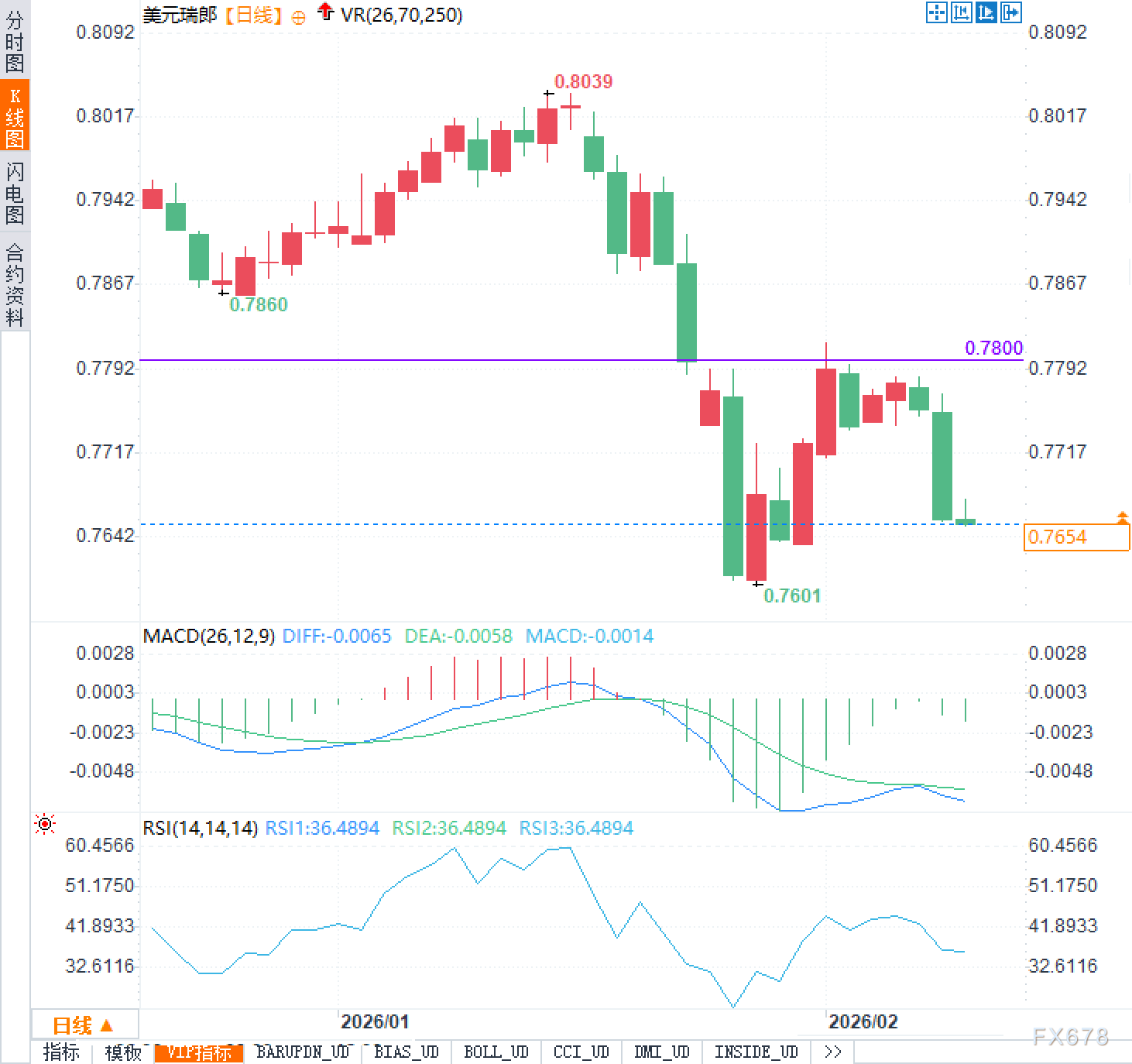 瑞士方面,最新公布的SECO消费者景气指数显示,截至1月的三个月内该指数回升至-30,好于前值-37,表明民众对自身财务状况和大额消费的意愿有所恢复。不过,对整体经济前景的信心仍在下滑,说明复苏基础并不牢固。这种结构性分化使得瑞郎短期内缺乏明确驱动,既没有强劲内需推动升值,也没有严重衰退引发大幅贬值。真正的方向性突破,还需等待下周五公布的1月消费者物价指数(CPI),以判断瑞士央行是否会调整当前的政策立场。